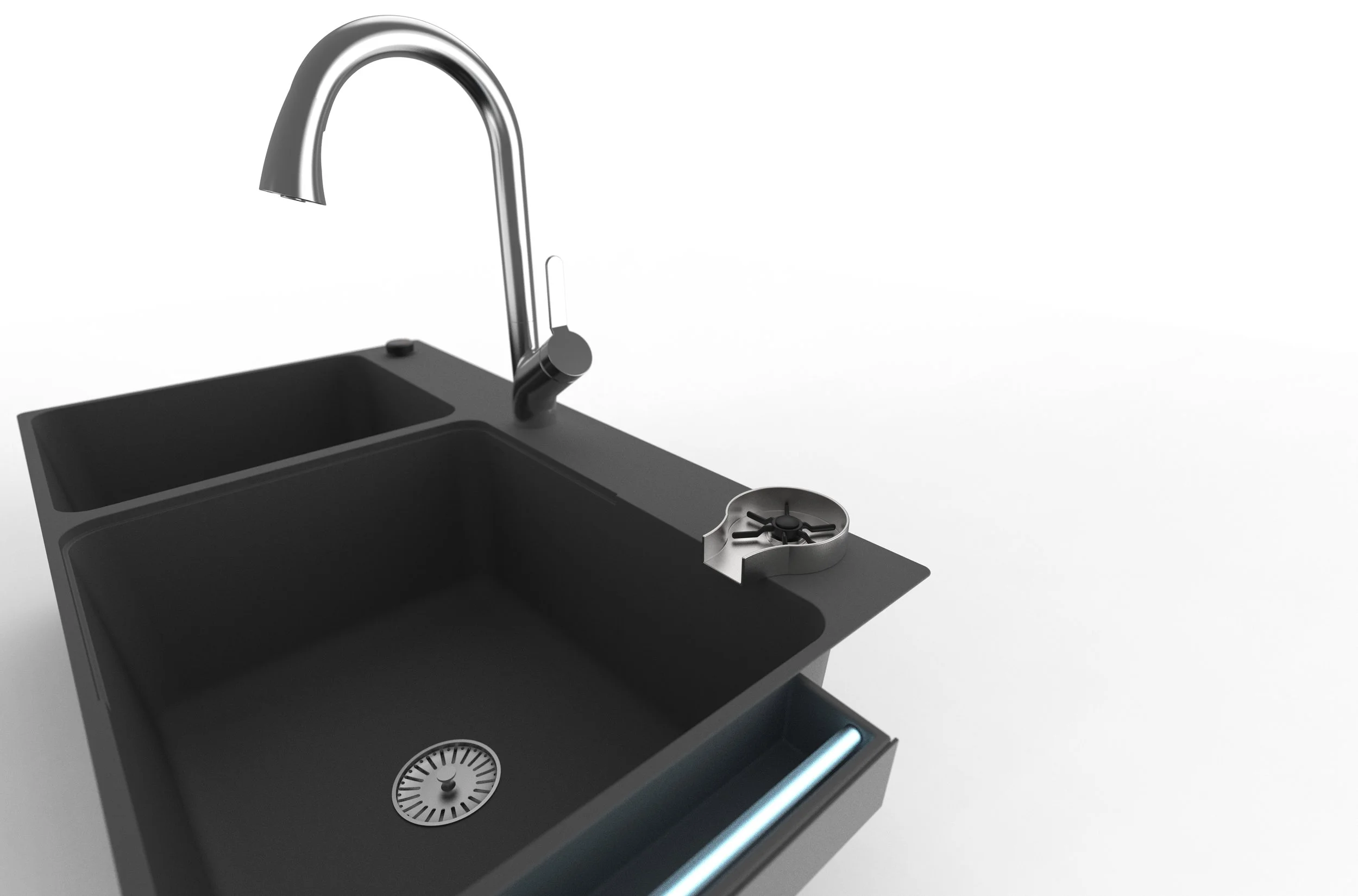 The left basin is designed to not only function as a regular sink basin, but also to store food at a desired temperature as the user prepares other food, or wants to keep the dish hot/cold while eating. The temperature is easily controlled by a twisting knob in the left corner of the sink.